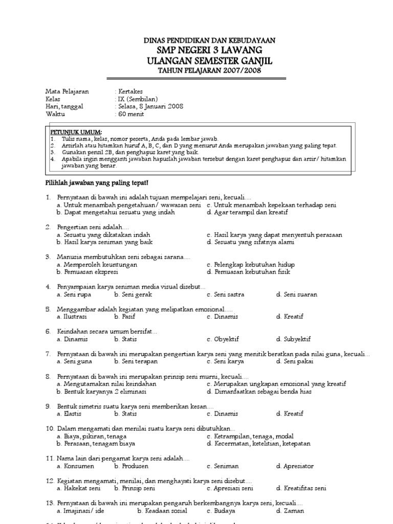 Soal Uas Seni Budaya Kelas 9 Semester 1 Kurikulum 2013 Rizsafa Informasi Pendidikan Informasi Pendidikan from 4.bp.blogspot.com Check spelling or type a new query. Soal dan jawaban uts seni budaya kelas 9 semester 1. Maybe you would like to learn more about one of these? We did not find results for: